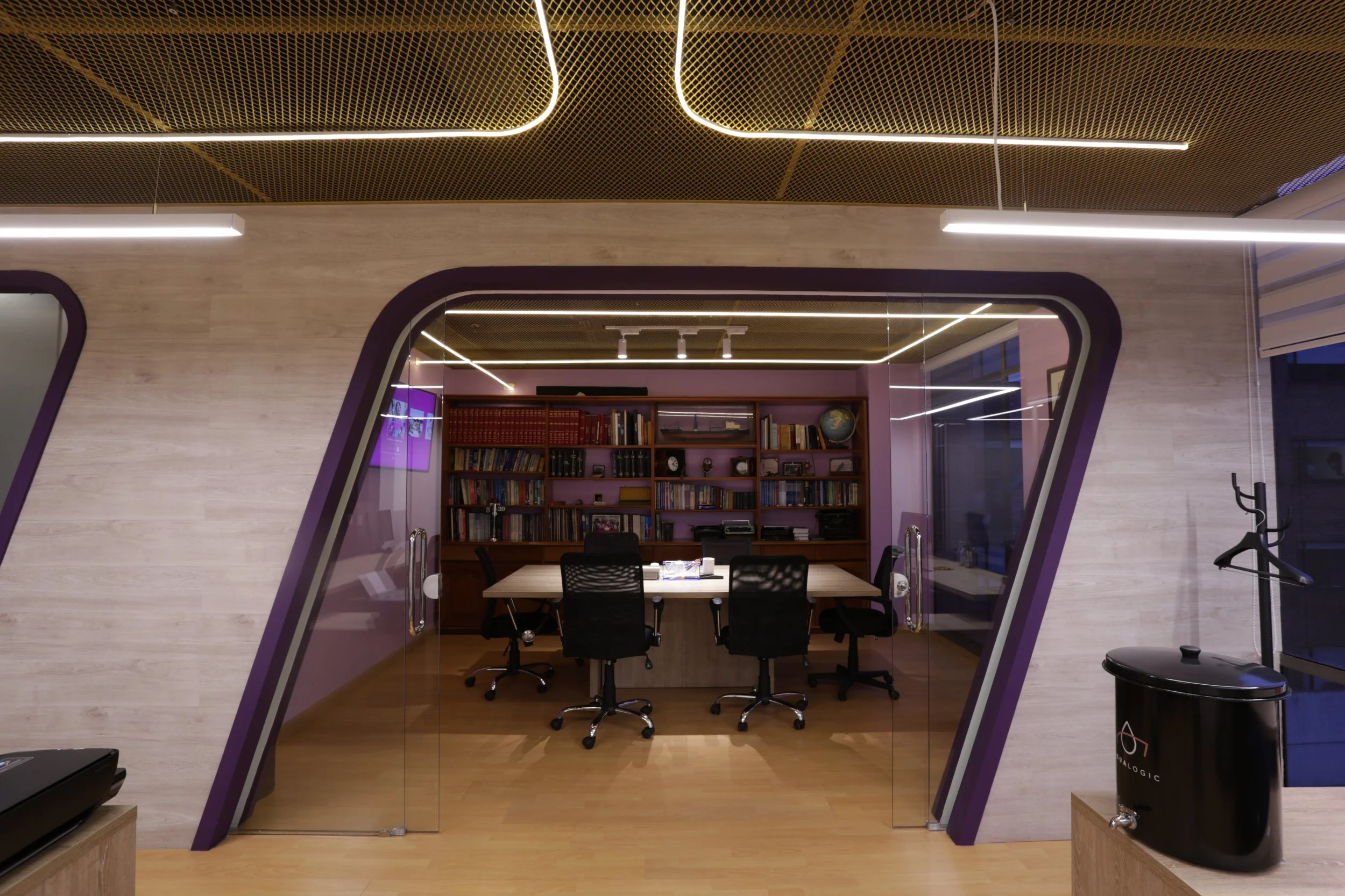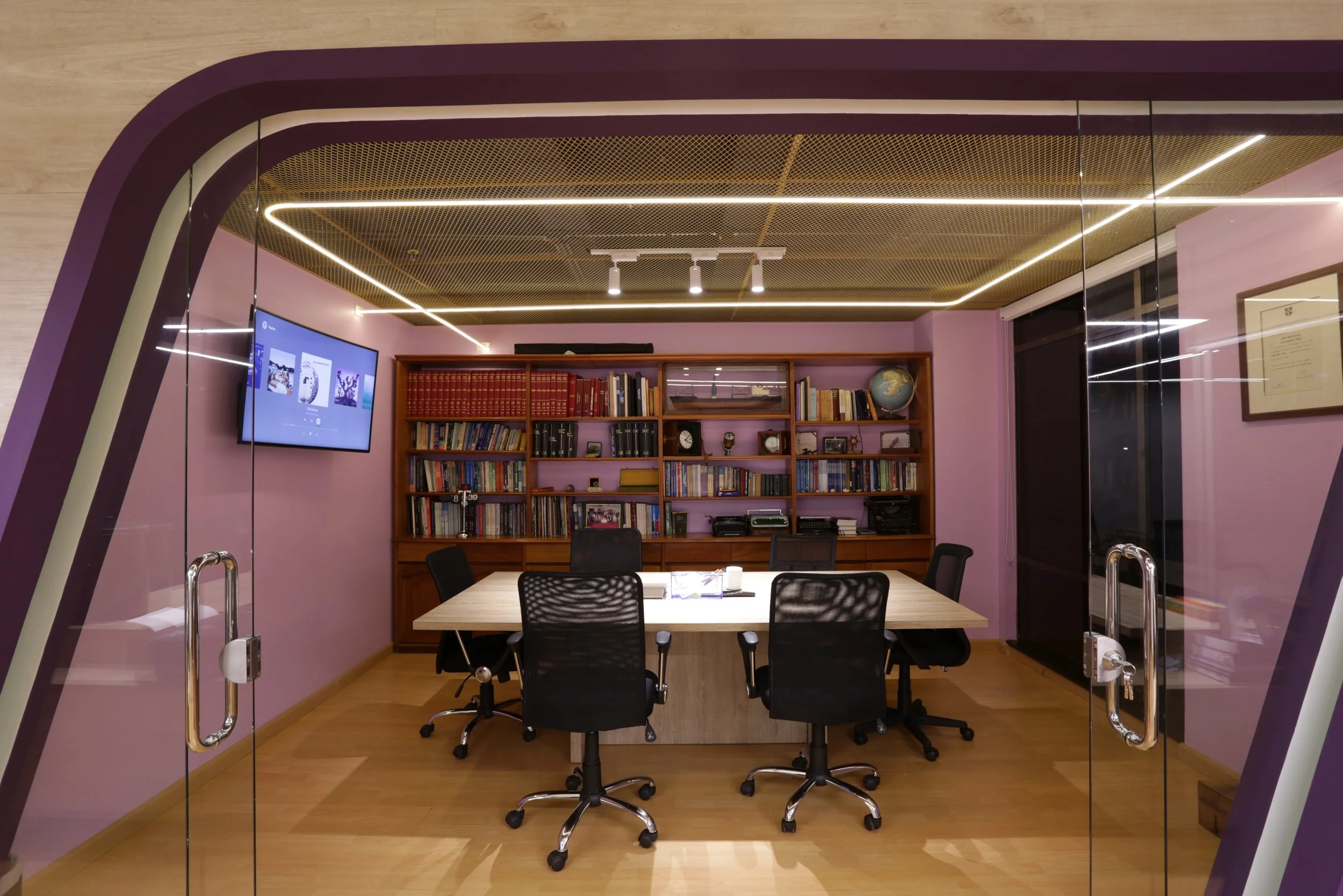 La sala de juntas es el mejor espacio de esta oficina, teniendo en cuenta que anteriormente carecían de este espacio el cual era determinante para su trabajo y para las largas reuniones que tenían con sus clientes. Este espacio polifuncional al ingreso tiene dos puertas de gran formato que se esconden bajo un muro doble acústico, permitiendo así realizar su función de sala de juntas o al dejar abiertas las puertas integrase con la zona de trabajadores para formar un gran open space.