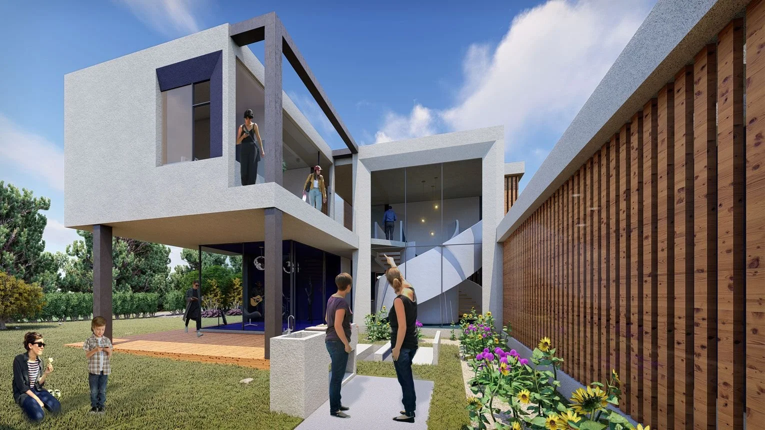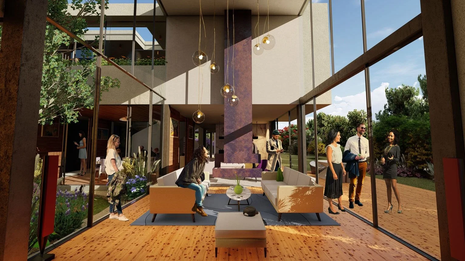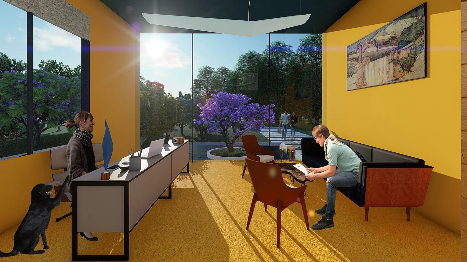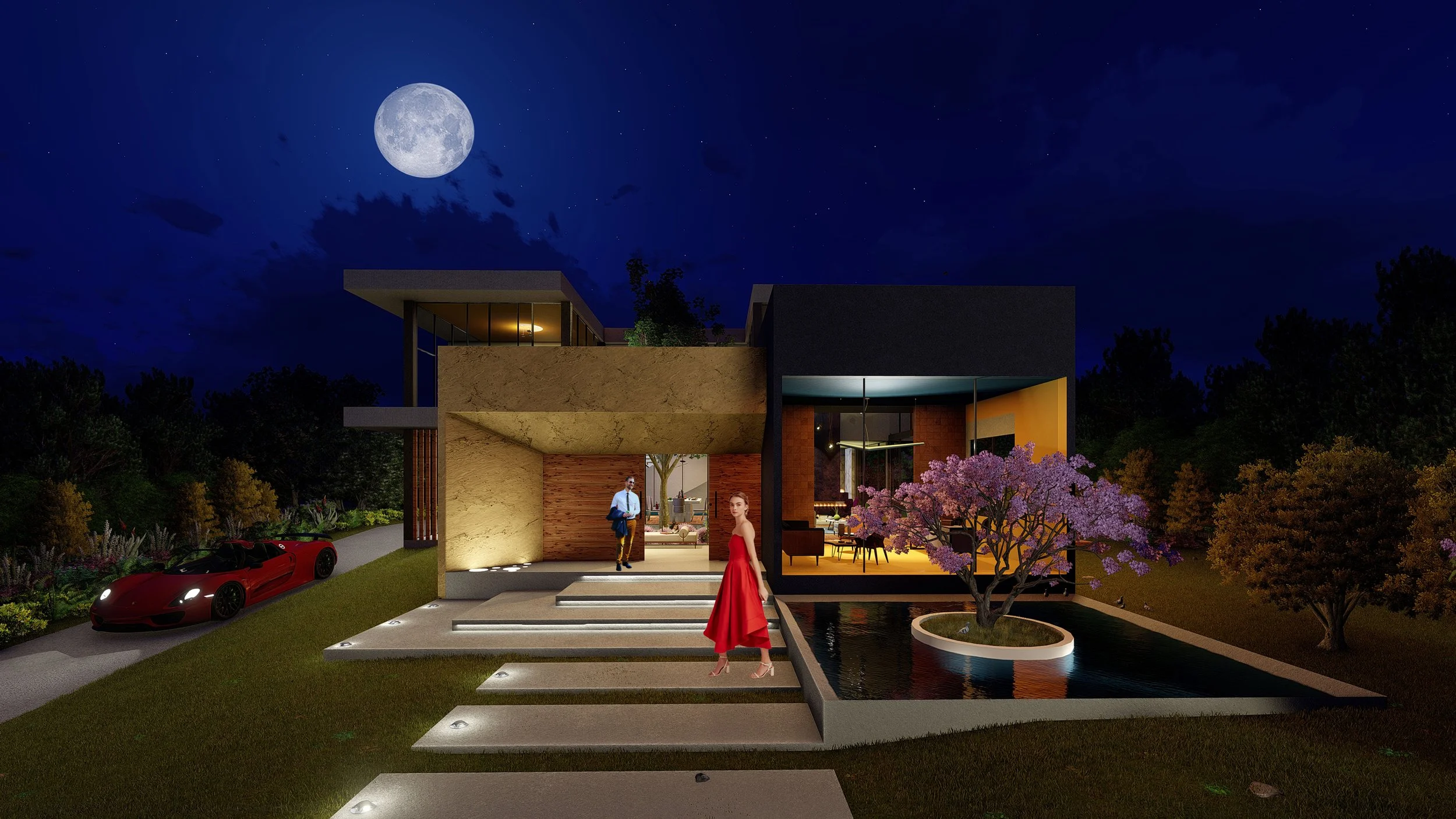 Un árbol de bajo porte en medio de un espejo de agua, es la primera vista que provee este proyecto, aportando a sus visitantes una gran portada como fachada principal, enmarcada por naturaleza. Luego de subir algunos escalones se llega a una zona que funciona como recibidor; desde este punto se puede dirigir en dos direcciones, la zona social y de ocio ó la zona semiprivada y de servicios.