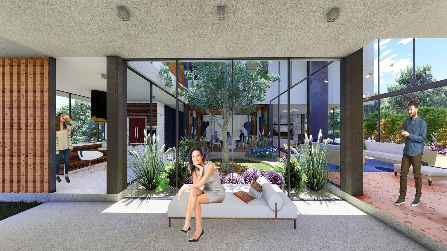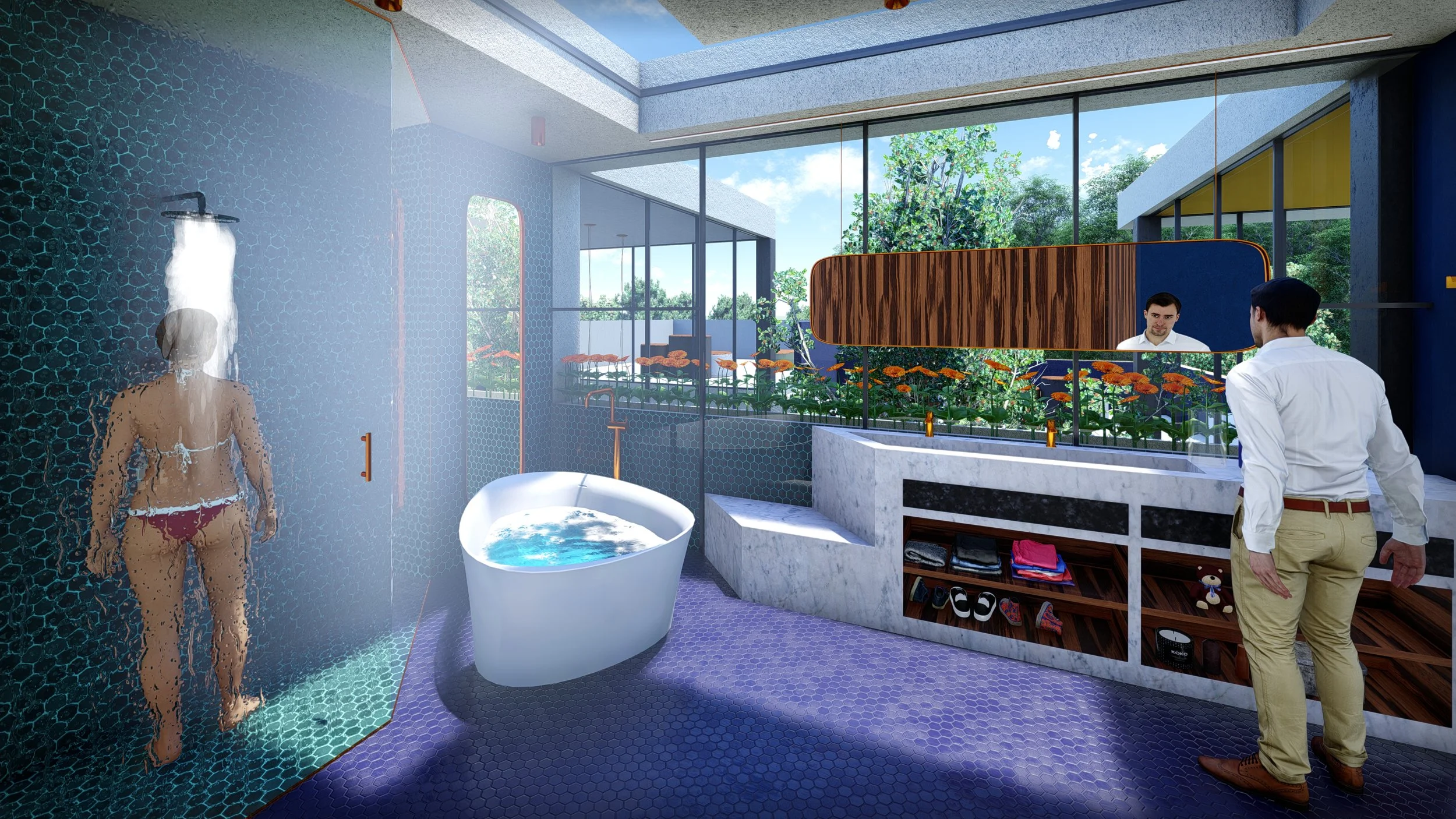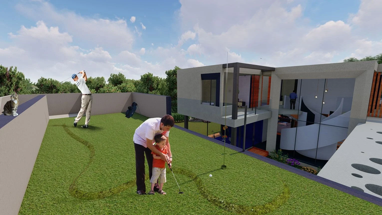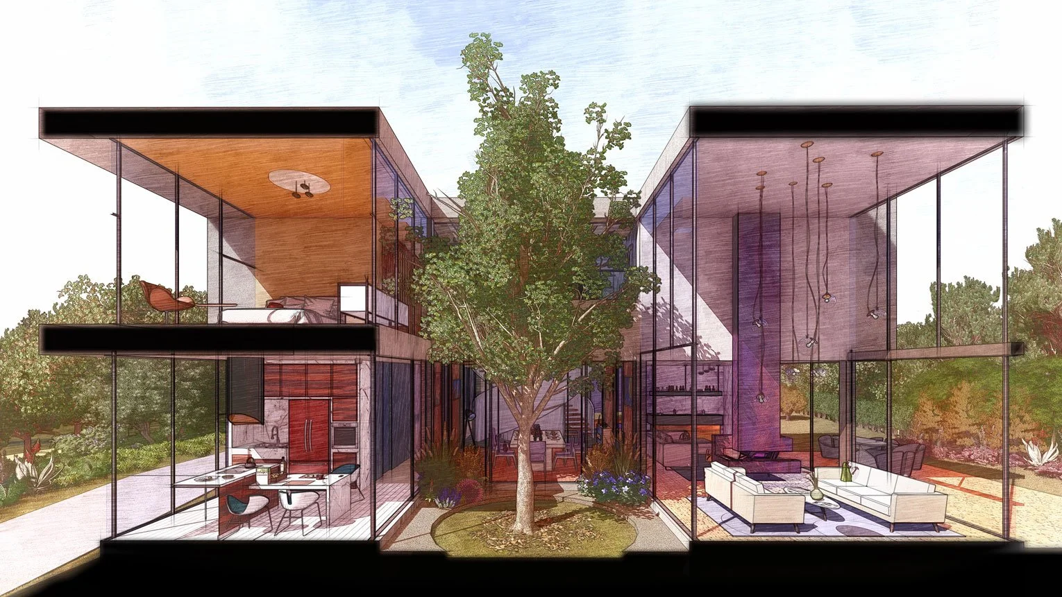 Un árbol de bajo porte en medio de un espejo de agua, es la primera vista que provee este proyecto, aportando a sus visitantes una gran portada como fachada principal, enmarcada por naturaleza. Luego de subir algunos escalones se llega a una zona que funciona como recibidor; desde este punto se puede dirigir en dos direcciones, la zona social y de ocio ó la zona semiprivada y de servicios.