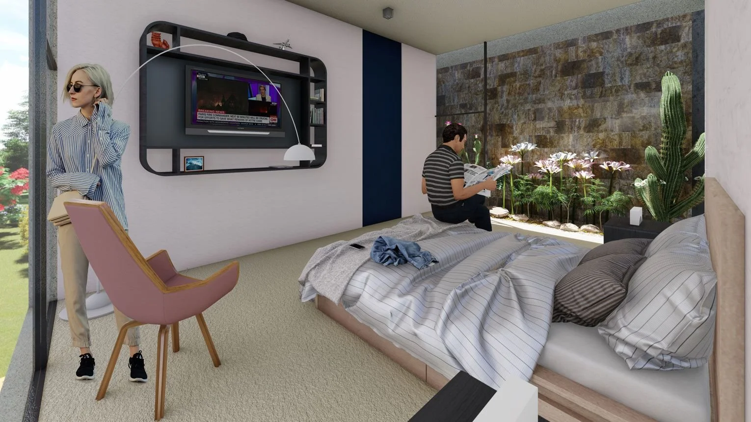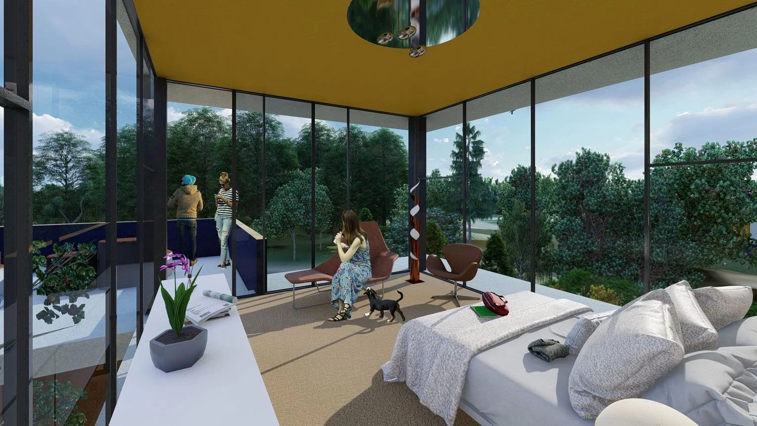 Accediendo por la escalera doble, ubicada en el centro de la casa se puede llegar a la habitación principal, la cuál permite desplazarse hasta un extenso balcón que abarca la mayoría de la fachada principal; es desde allí donde se puede percibir el gran paisaje en donde se ubica este proyecto. Teniendo en cuenta la importancia de la iluminación cenital, el espacioso baño principal permite tener un lugar bañado por luz natural tanto desde la parte superior como desde la parte frontal.