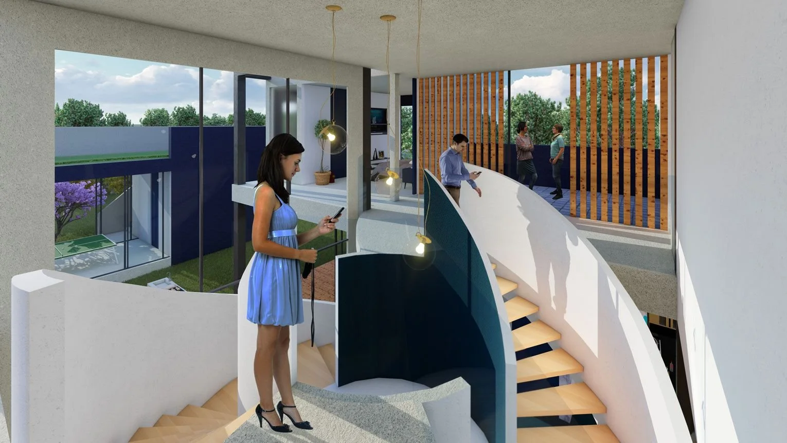 La particular escalera de doble sentido, posee un lugar de lectura en su centro, permitiendo al usuario poder escoger el sentido y dirección de ascenso y/o descenso. Es por esto que desde este punto se puede ascender a las dos alas del proyecto. Si se toma el otro sentido, se llega a las habitaciones auxiliares, las cuales poseen vista al exterior y una de ellas un pequeño jardín interior que vivifica la vista y el espacio. En medio de ambas habitaciones se halla un balcón, que reduce la carga volumétrica del proyecto y asiente el concepto de conexión con el exterior.